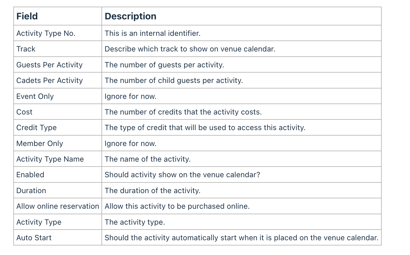 These activity descriptions are the activity types that will be seen in the venue calendar. A few examples include racing, rock climbing, jumping, etc.