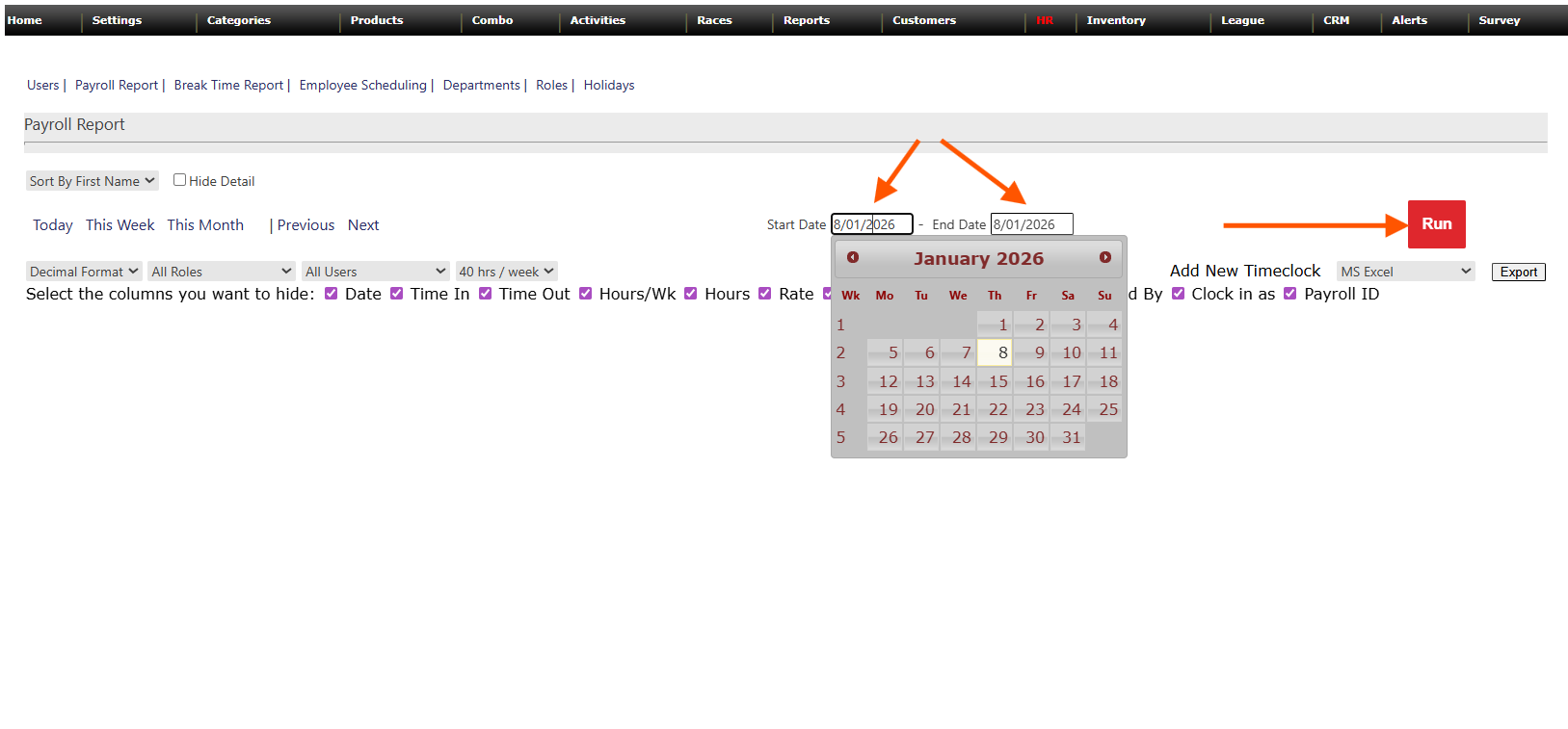 Step 3: Use the date filters to select the requested reporting period. Then click run to generate the report.