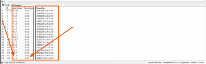 To confirm a customer’s Clubspeed version, check the dbo.Version_CS table in the ClubspeedV8 database. The latest record indicates the active version installed.