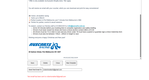 Once you have followed the instructions above, SAVE the email template,andsend yourself a test email, to review the completed template.