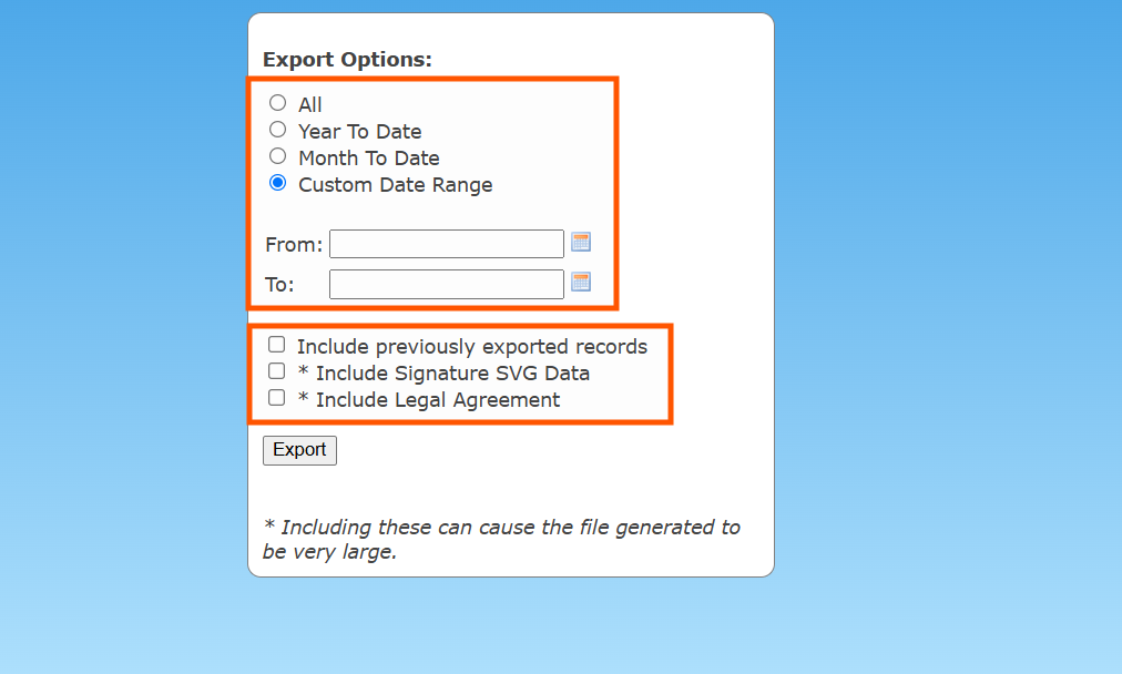 - Custom Date Range – Allows you to specify a start and end date for the export.