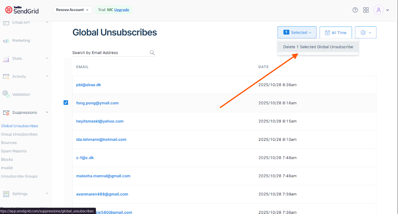 - If the email is present and the customer approves, select the email. In the upper-right corner, click Delete to remove it from the Global Unsubscribe list.