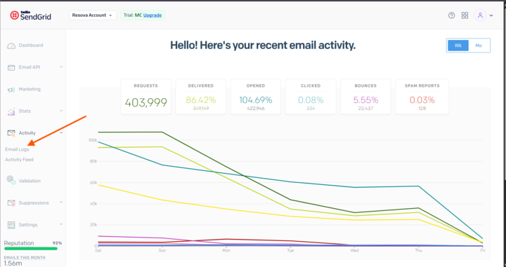On the left side of SendGrid, click on Activity. This will expand additional options.- Click on Email Logs.
