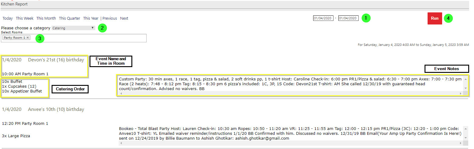 Does your facility have a kitchen on site that needs to know what each party has ordered for their catering and what time they will be in their party room? If yes, then this report is for your team!