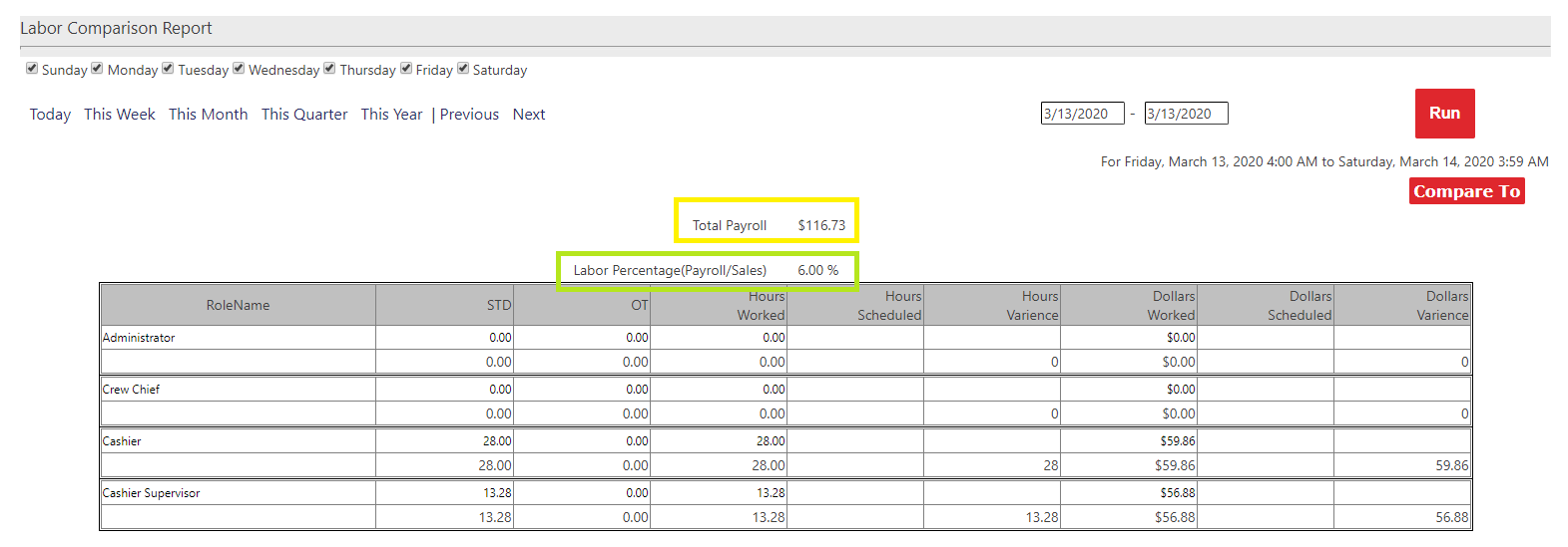 The most important number on this report is the "Labor Percentage(Payroll/Sales) = 6.00 %"