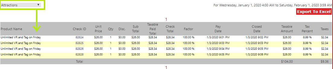 You can also click on each Product Class, on the far left, to view a deeper breakdown of the products. Once on the Tax Detail window, you can use the drop down to change to a different Product class.
