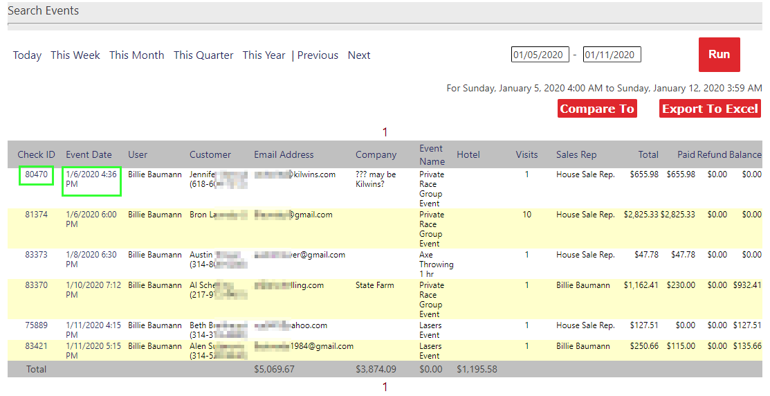 The Search Events report gives you another quick overview of all events scheduled within the date range you have set. Here you can click on the CheckID number and see a preview of the check, or you can click on the Event Date and view the entire Event Reservation in printable format.